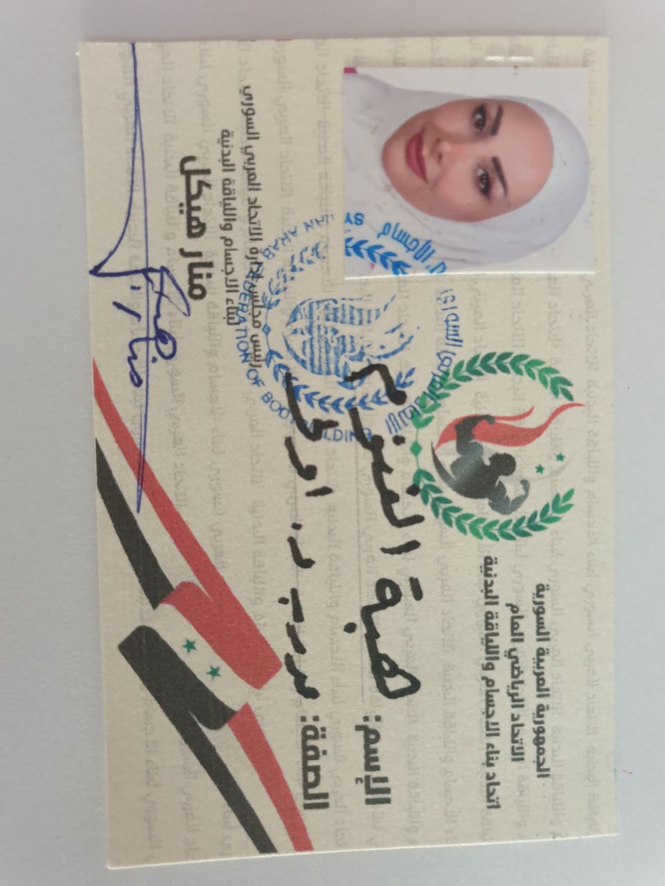 وأضافت: «شاركت في بطولة دمشق لمصارعة الأذرع عام2021 وحصلت على المركز الأول بعد ذلك أصبحت عضوا في اللجنة الفنية الفرعية في دمشق لبناء الأجسام فبدأت المشاركة إثر ذلك في معظم البطولات بصفتي حكم فني إلى أن نلت شهادة حكم من الدرجة الأولى وبذلك كنت أول سيدة سورية تتبوأ هذا المنصب».